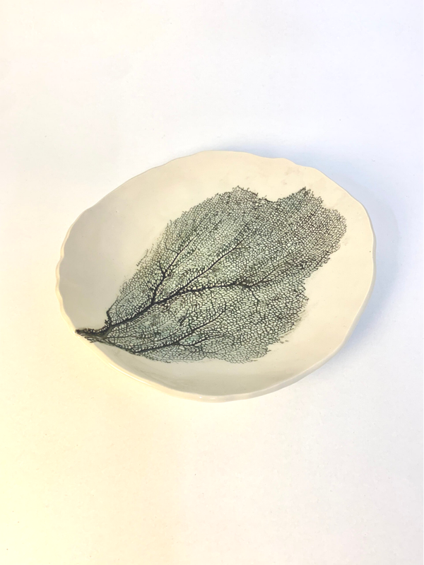 Platte schaal van witte klei met zwarte decoratie en voorzien van transparant glazuur. Deze unieke schaal is met de hand opgebouwd. Het is gemaakt van steengoed en vaatwasserbestendig. De diameter bedraagt 24-26 cm en hij is 5 cm hoog.