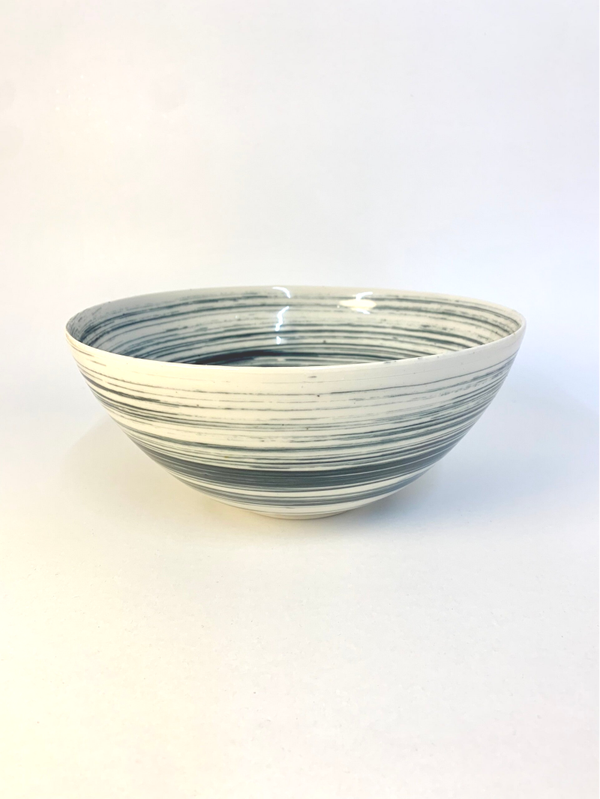 Diepe schaal van witte klei met zwarte decoratie en voorzien van transparant glazuur. Deze unieke schaal is op de schijf gedraaid. Het is gemaakt van steengoed en vaatwasserbestendig. De diameter bedraagt 22 cm en hij is 10 cm hoog.
