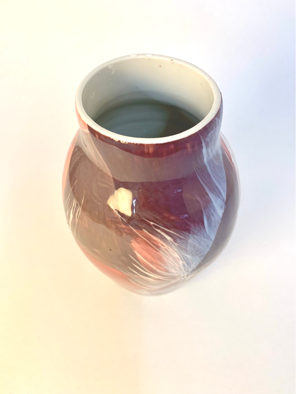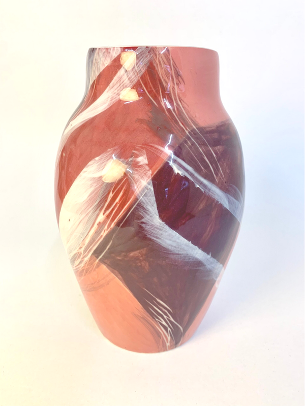 Kleine vaas van witte klei met roze/auberine decoratie en voorzien van transparant glazuur. De vaas is op de schijf gedraaid. Het is gemaakt van steengoed en vaatwasserbestendig. De diameter bedraagt 13 cm en hij is 20 cm hoog.