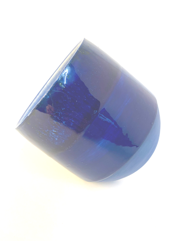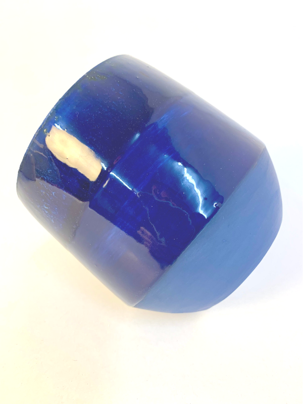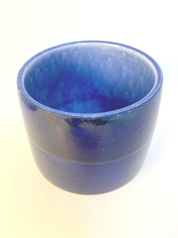 Kleine pot van porselein met blauwe decoratie en voorzien van blauw effectglazuur. De pot is op de schijf gedraaid. Het is vaatwasserbestendig. De diameter bedraagt 12 cm en hij is 12 cm hoog.